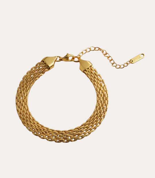 Celina armbånd har et tæt flettet design i 18 karat guldbelagt stål. Med en længde på 18+7 cm og en fyldig bredde på 8 mm er det et elegant statement, du kan bære hver dag.