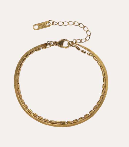 Solea armbåndet kombinerer to kædetyper – en klassisk leddelt kæde og en glat snake chain – i ét elegant og moderne design med 58 mm i diameter og justerbar længde.