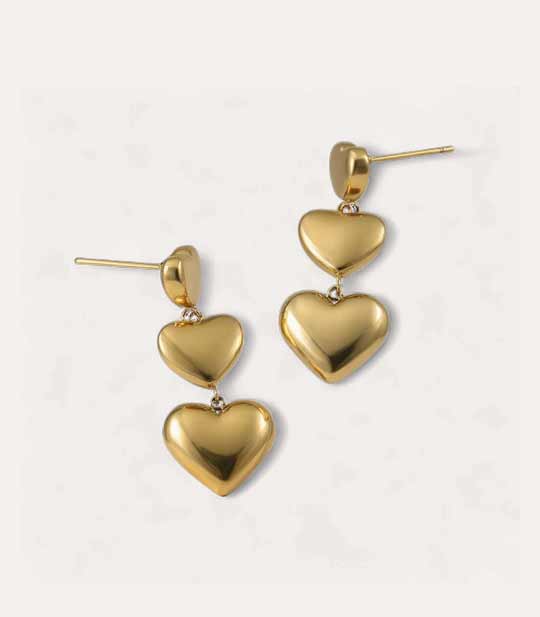 Amora øreringene består af tre blankpolerede hjerter, der tungt og elegant falder under hinanden og skaber et feminint og iøjnefaldende look.