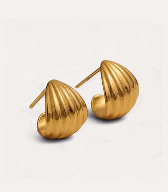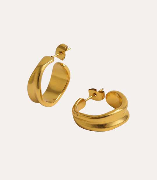 Alina øreringene har en bølgende, organisk form, der emmer af selvsikkerhed og stil. De er fremstillet i rustfrit stål og belagt med 18K guld eller sølv – perfekte til at løfte dit look med et kunstnerisk twist.