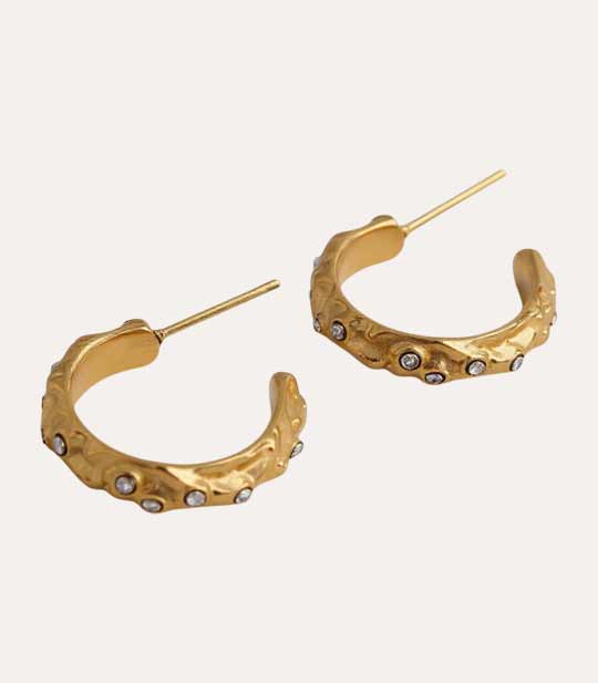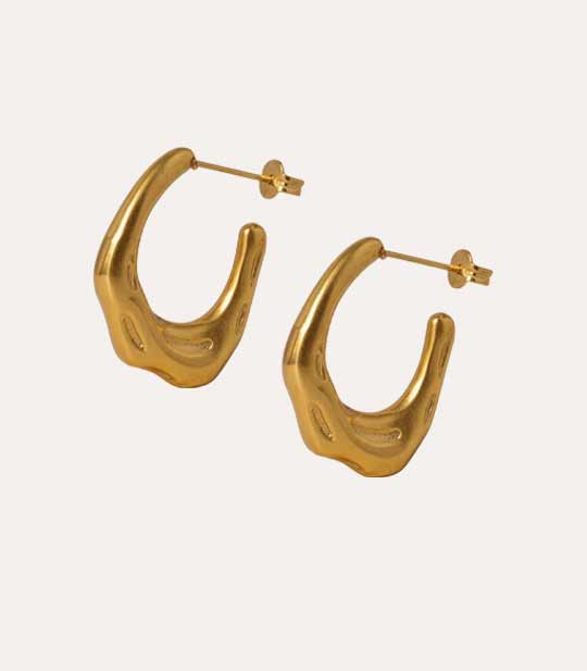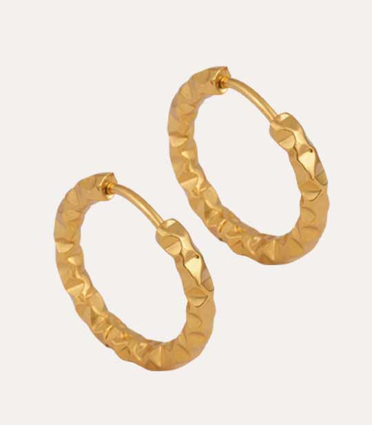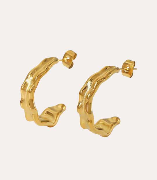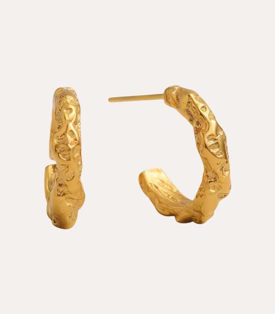 Leona øreringene er rå og elegante hoops med hamret overflade. Fremstillet i guldbelagt rustfrit stål – vandfaste, nikkelfri og allergivenlige.