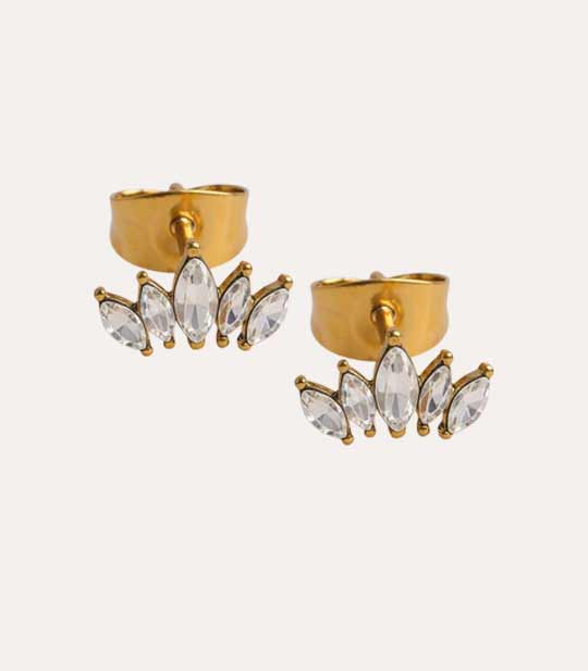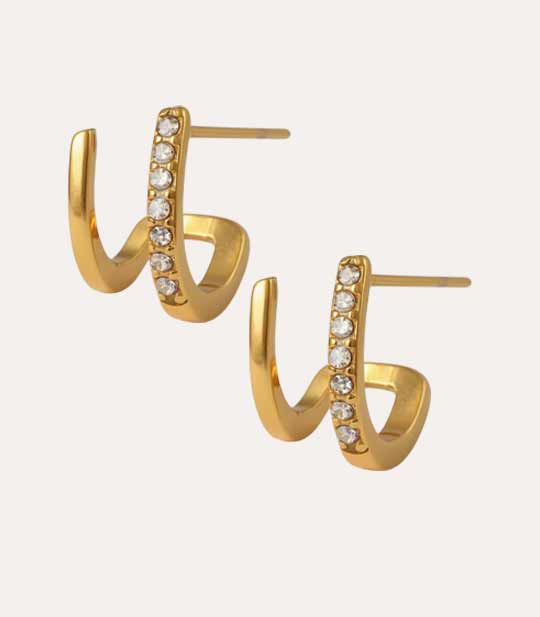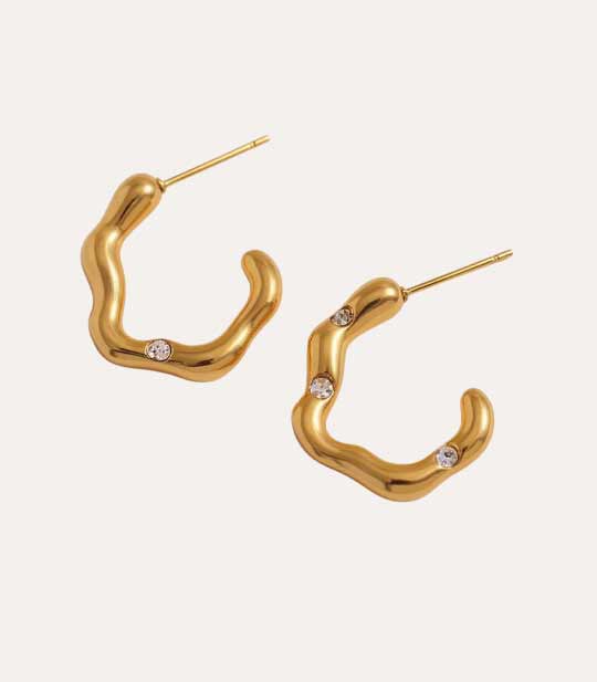 Elara øreringene kombinerer organiske former med funklende zirkoner i et elegant og feminint design. Fremstillet i 316L rustfrit stål med 18K guldbelægning – perfekte til både hverdag og fest.