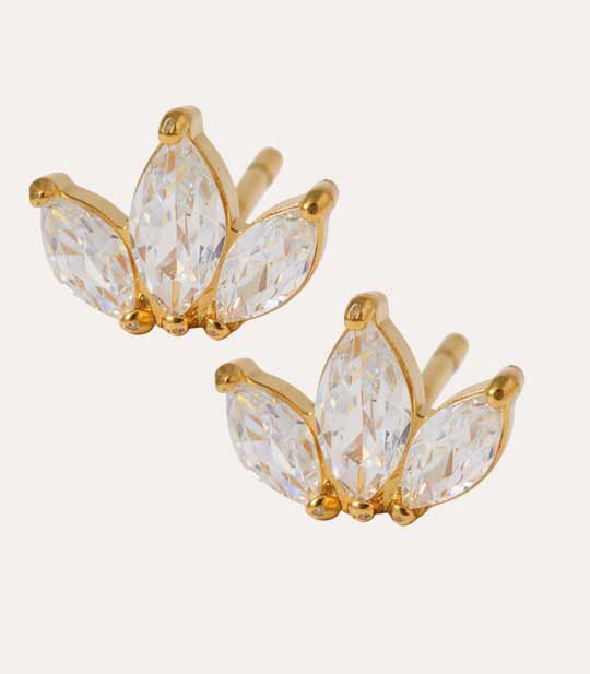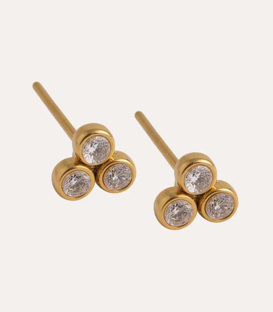 Marisse øreringene er elegante ørestikker med tre klare krystaller samlet i et feminint design. Fremstillet i guldbelagt rustfrit stål – vandfaste og allergivenlige.