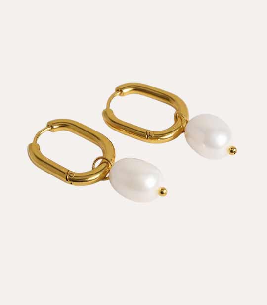 Coralie er elegante hoops i guldbelagt rustfrit stål med fine perlevedhæng. De måler 3 cm i længden og vejer 8,3 g pr. par. Vandfaste, slidstærke og allergivenlige – et feminint smykke, der kombinerer klassisk perlecharme med moderne design.