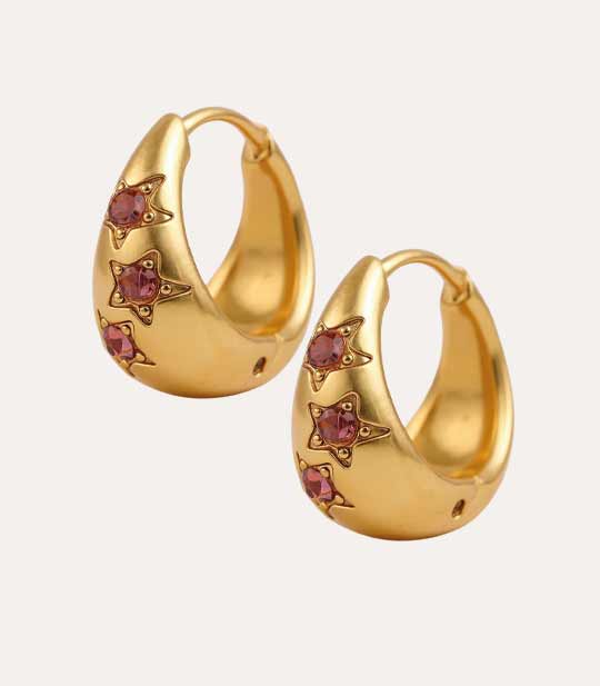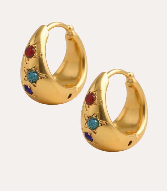 Freya øreringene har funklende sten i rød, grøn og blå. De er lavet i vandfast, guldbelagt rustfrit stål og måler ca. 12 mm i højden – perfekte alene eller sammen med Sigrid og Gudrun fra samme serie.