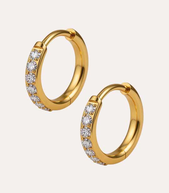 Maris er et sæt elegante hoops med indfattede klare sten hele vejen rundt. Det klassiske design og de funklende detaljer gør dem perfekte til både hverdag og fest.