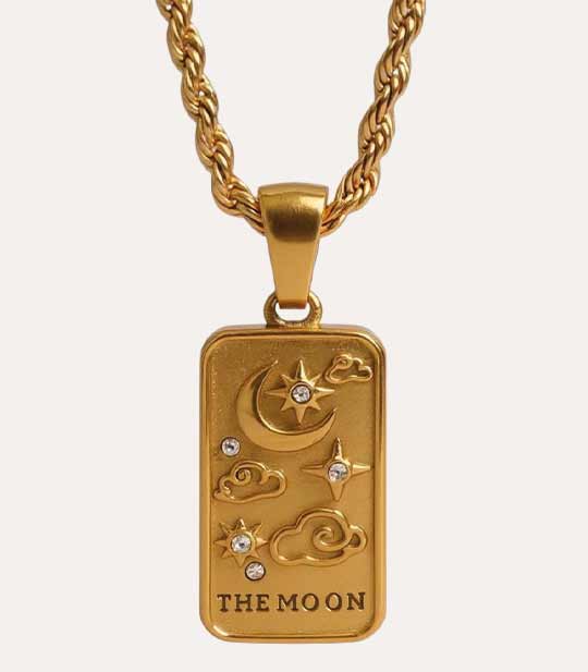 Moon halskæden bærer et smukt vedhæng med måne, stjerner og skyer – et symbol på drømme, intuition og mystik. Perfekt som personlig amulet eller gave.