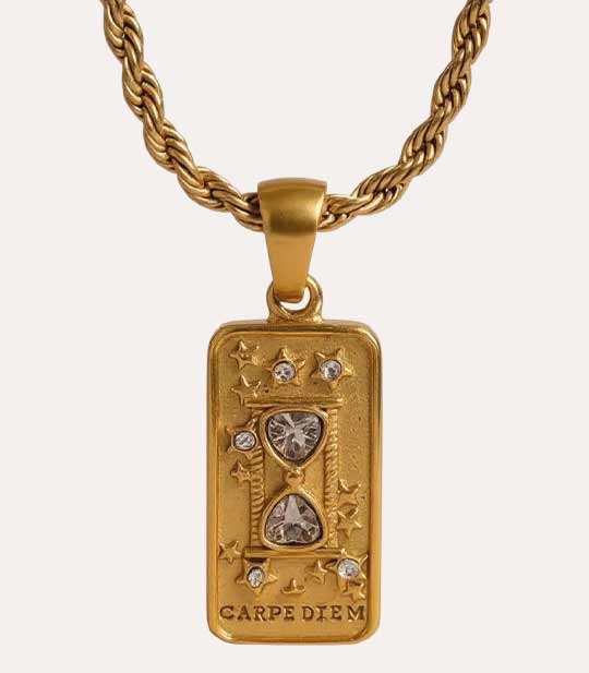 Et smykke med budskab: Carpe Diem halskæden forener et elegant timeglas-design med stjernedetaljer og glimtende sten – en daglig påmindelse om at leve i nuet.