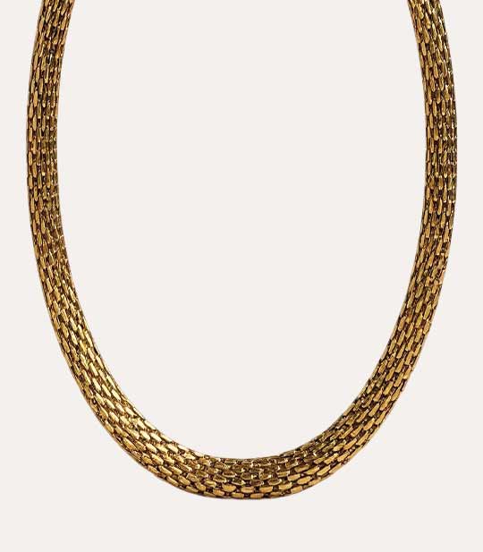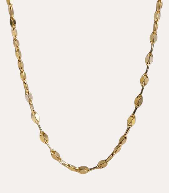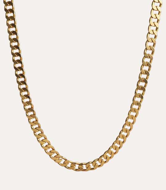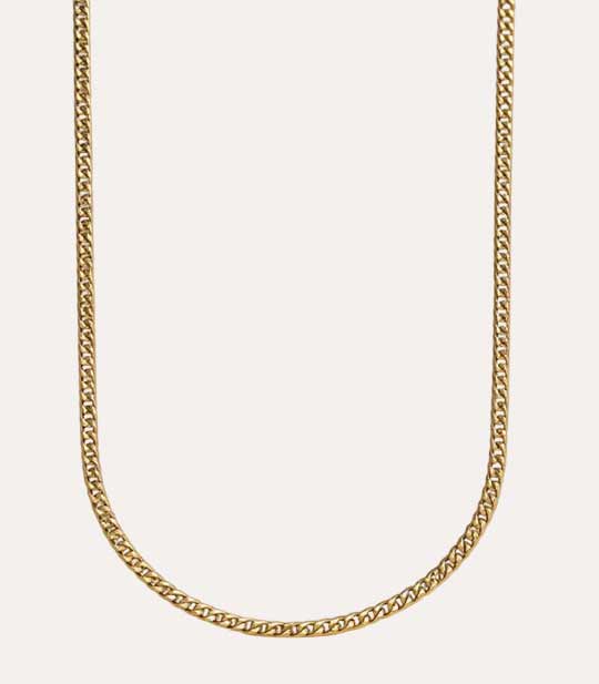 Éloise er en elegant flat curb halskæde i guldbelagt rustfrit stål – perfekt til lag-på-lag look eller alene som et simpelt statement. Vandfast, slidstærk og klar til hverdagsbrug.