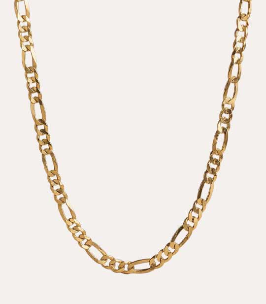 Chiara er en klassisk Figaro-halskæde i 18K guldbelagt rustfrit stål. Med sin karakteristiske rytme i kædeleddene og en bredde på 3 mm skaber den et elegant, men markant udtryk. Justerbar længde (45 + 5 cm), vandfast og nikkelfri.