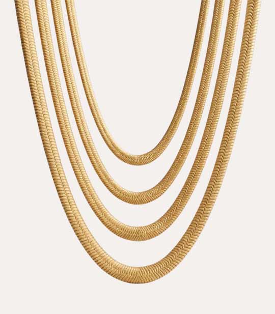 Sofia Halskæden er en klassisk flad slangehalskæde i herringbone-design. Den fås i længderne 40+5 cm og 45+5 cm samt i bredderne 2, 3, 4 og 5 mm.