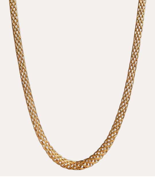 Celina halskæden kombinerer klassisk elegance med moderne kant. Det tætte, flettede mønster og 18K guld-og sølvbelægning giver et luksuriøst udtryk. Med justerbar længde (40 + 5 cm) og en bredde på 6 mm matcher den perfekt med Celina armbåndet – ideel til et stilfuldt, sammenhængende smykkelook. Nikkelfri og vandfast.