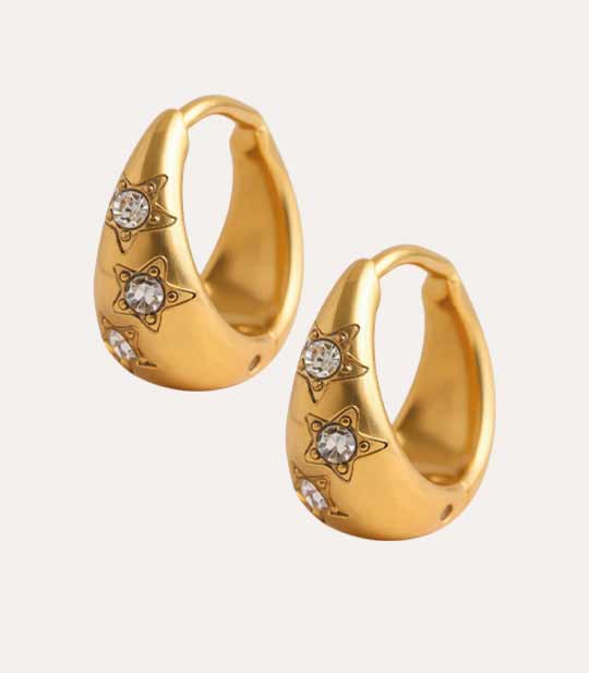Elara øreringene kombinerer organiske former med funklende zirkoner i et elegant og feminint design. Fremstillet i 316L rustfrit stål med 18K guldbelægning – perfekte til både hverdag og fest.