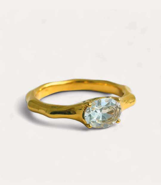 Liora har et blødt, bølgende bånd og en funklende klar sten i midten. Et klassisk, feminint smykke med moderne kant – perfekt til både hverdagsglam og særlige anledninger.