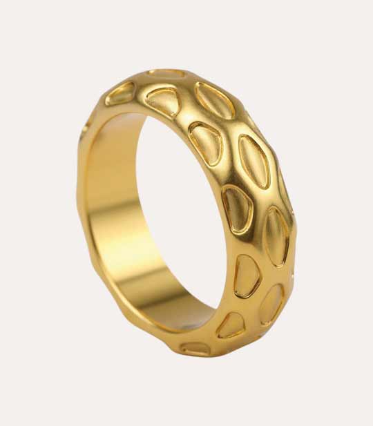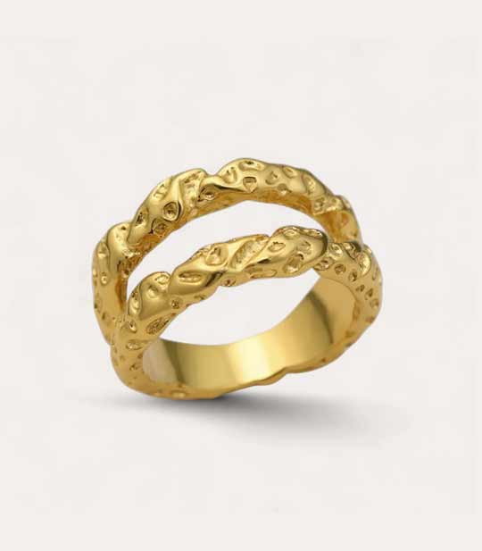 Alma Ring er et karakterfuldt og feminint smykke med en rå, håndformet tekstur, der fanger lyset fra alle vinkler. Den er fremstillet i rustfrit stål og belagt med 18 karat guld, hvilket giver en elegant glød og lang holdbarhed.