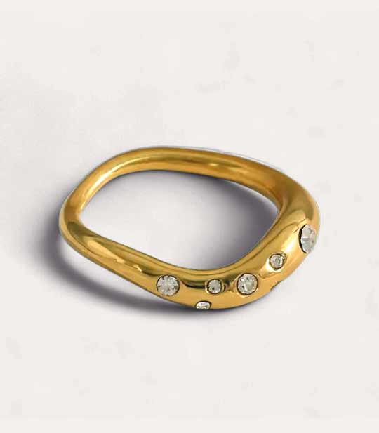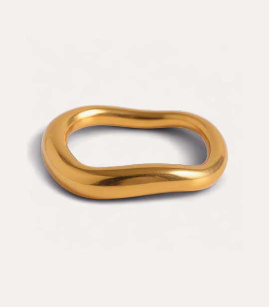 Clea er en skulpturel ring med bløde, bølgende former og en elegant blank finish. Fås i 18K guldbelagt eller sølvbelagt rustfrit stål. Let at style alene eller i stack. Nikkelfri og vandfast – perfekt til både hverdag og fest.