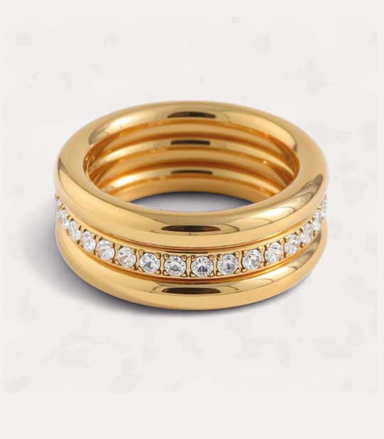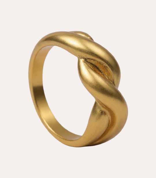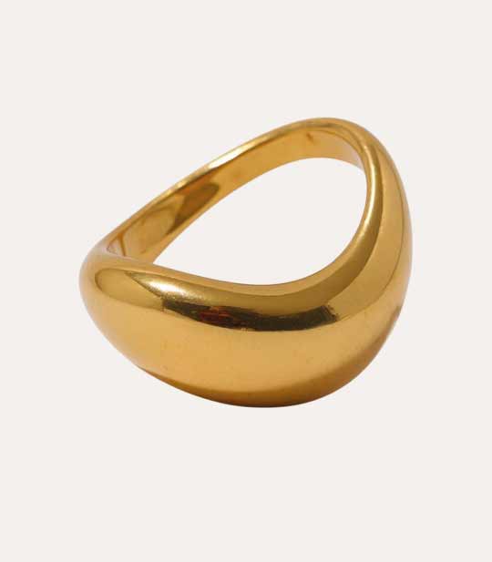 Soleil er en elegant og moderne ring i 18K guldbelagt rustfrit stål. Den skulpturelle form og det rene design gør den til et tidløst statement – perfekt både alene og i kombination med andre smykker.