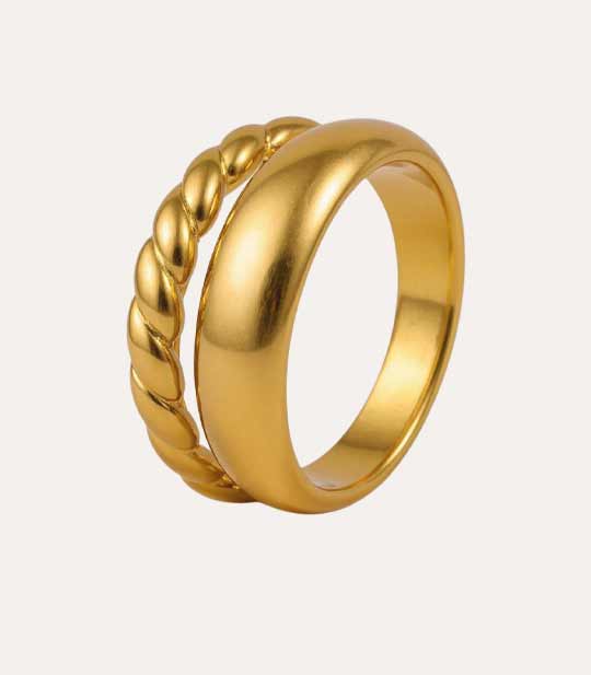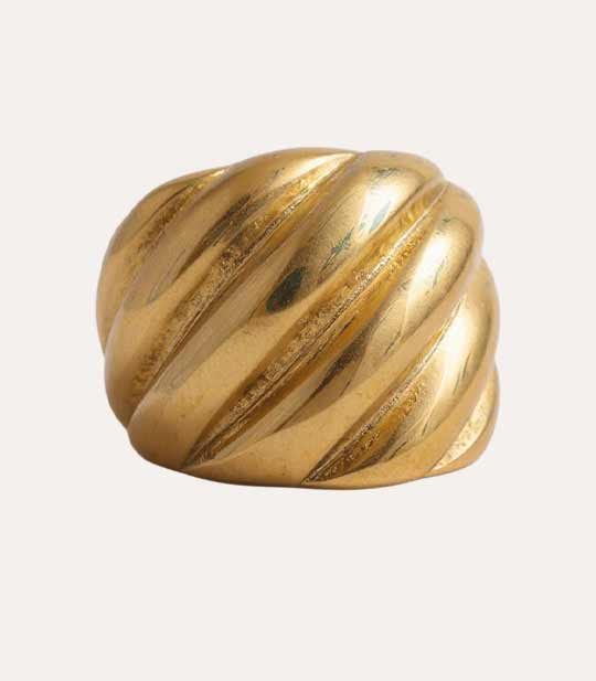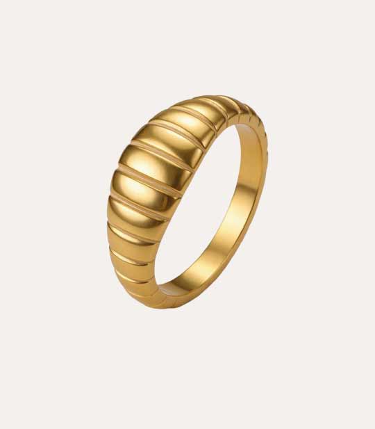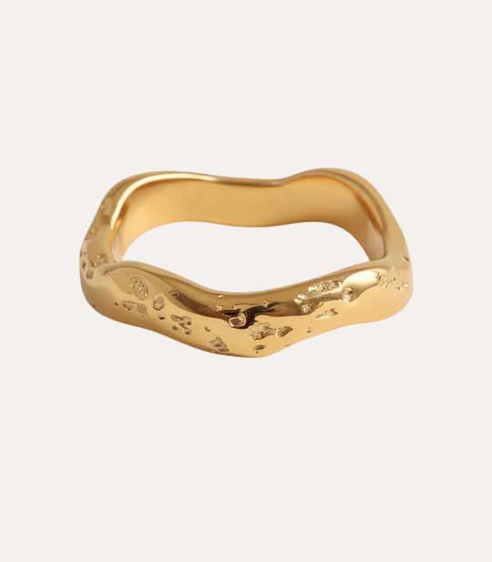Solenne er en elegant ring i 18K guldbelagt rustfrit stål med en bølget overflade i toppen. Det organiske design giver ringen karakter og et moderne touch – perfekt alene eller i kombination med andre smykker.