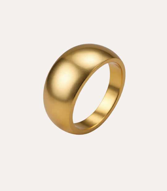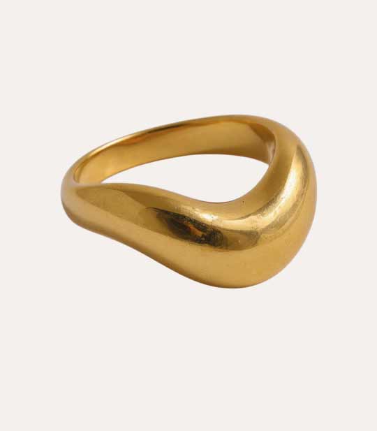 Amara er en voluminøs og stilren ring i 18K guldbelagt rustfrit stål. Et tidløst smykke med blød kurve og eksklusivt udtryk – perfekt som statement piece alene eller i kombination med andre ringe.