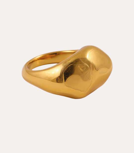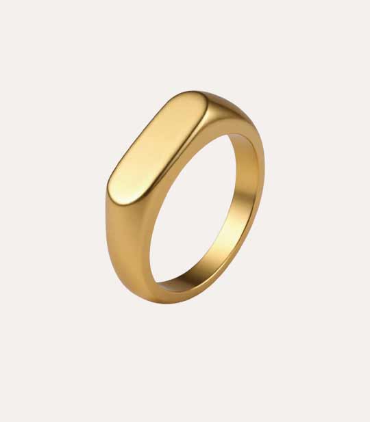 Solia er en elegant og minimalistisk signetring i 18K guldbelagt rustfrit stål. Den aflange, bløde overflade giver ringen et moderne og roligt udtryk – ideel alene eller som en del af dit personlige stack.