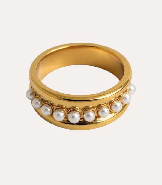 Léonie er en feminin og karakterfuld ring med små indfattede perler, der giver et sofistikeret og moderne udtryk. Fremstillet i 18K guldbelagt rustfrit stål og måler 10 mm i bredden.