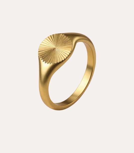 Solara er en elegant signetring med et indgraveret solmotiv – et symbol på varme, styrke og energi. Den forgyldte overflade giver et tidløst udtryk, mens det rustfri stål sikrer, at ringen holder sig smuk år efter år – også i vand.