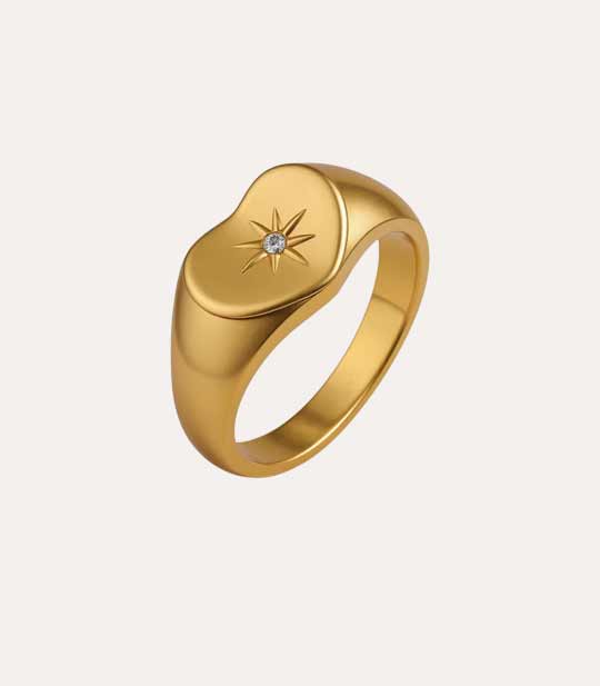 Noema er en elegant signetring med et delikat måne- og stjernemotiv, der symboliserer intuition og indre ro. Den forgyldte overflade giver et luksuriøst udtryk, mens det rustfri stål sikrer, at ringen bevarer sin glans – også når du bærer den hver dag.